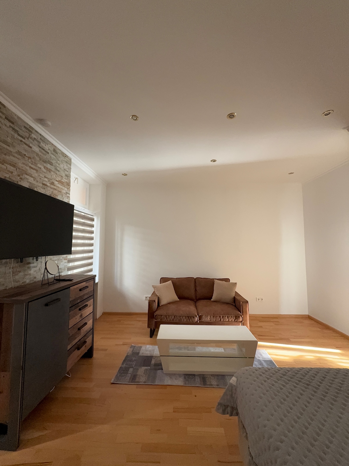 Voll ausgestattetes, 2025 frisch saniertes Appartement im Untergeschoss unseres selbstgenutzten Hauses. Der separate, stufenlose Eingang mit Rampe sorgt für einen bequemen und unabhängigen Zugang. Ausstattung Eigenes Bad Praktische Kochnische mit 2-Platten-Induktionskochfeld, Kühlschrank mit Eisfach, Spüle & Küchenutensilien Großer 50" Smart-TV mit Netflix & Amazon Prime Doppelbett (140 cm) Esstisch mit zwei Stühlen.