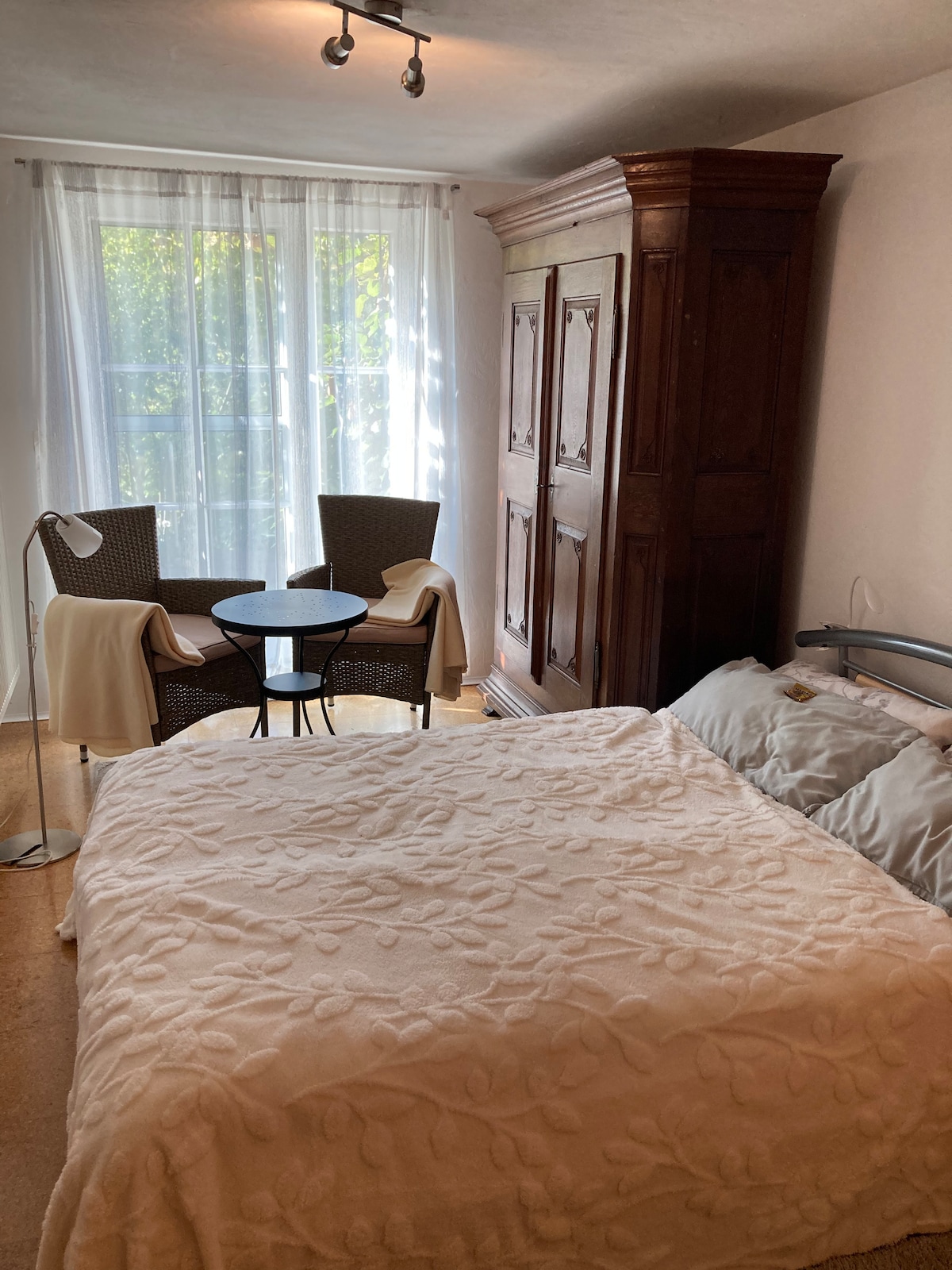 Helles 1-Zimmer-Appartement ca. 48 m², Küche, Bad, separater Eingang, Terrasse. Die Wohnung befindet sich im UG, über 9 Stufen zu erreichen. Parkettboden und Fußbodenheizung schaffen eine angenehme Atmosphäre. Die Wohnung ist mit einem 1,60 x 2,00 m Bett, Kommode, offenem Kleiderschrank, Schreibtisch, Sesseln, Fernseher, Esstisch, Stühlen ausgestattet. Eine Küche mit Grundausstattung bietet die Möglichkeit zur Selbstversorgung. Großer Kühlschrank und Cerankochfeld mit Backofen sind vorhanden.