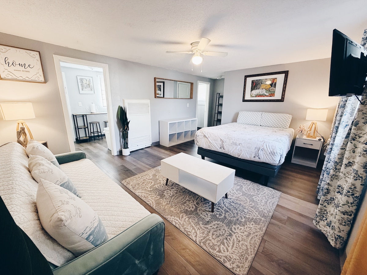 Approximately 850 sq ft upstairs guest suite, suitable for corporate travelers and vacationers alike. Available for short or extended stays. All ceilings and walls cypress wood and floors poplar wood. Decor coastal / lake . Beautiful relaxing view of lake and lush landscaping. 5 minutes or less to interstate 75,Home Depot distribution center and Quail Branch Plantation venue. Located within 15 minutes of Wild Adventures theme park , PCA and also Valdosta Georgia regional airport.