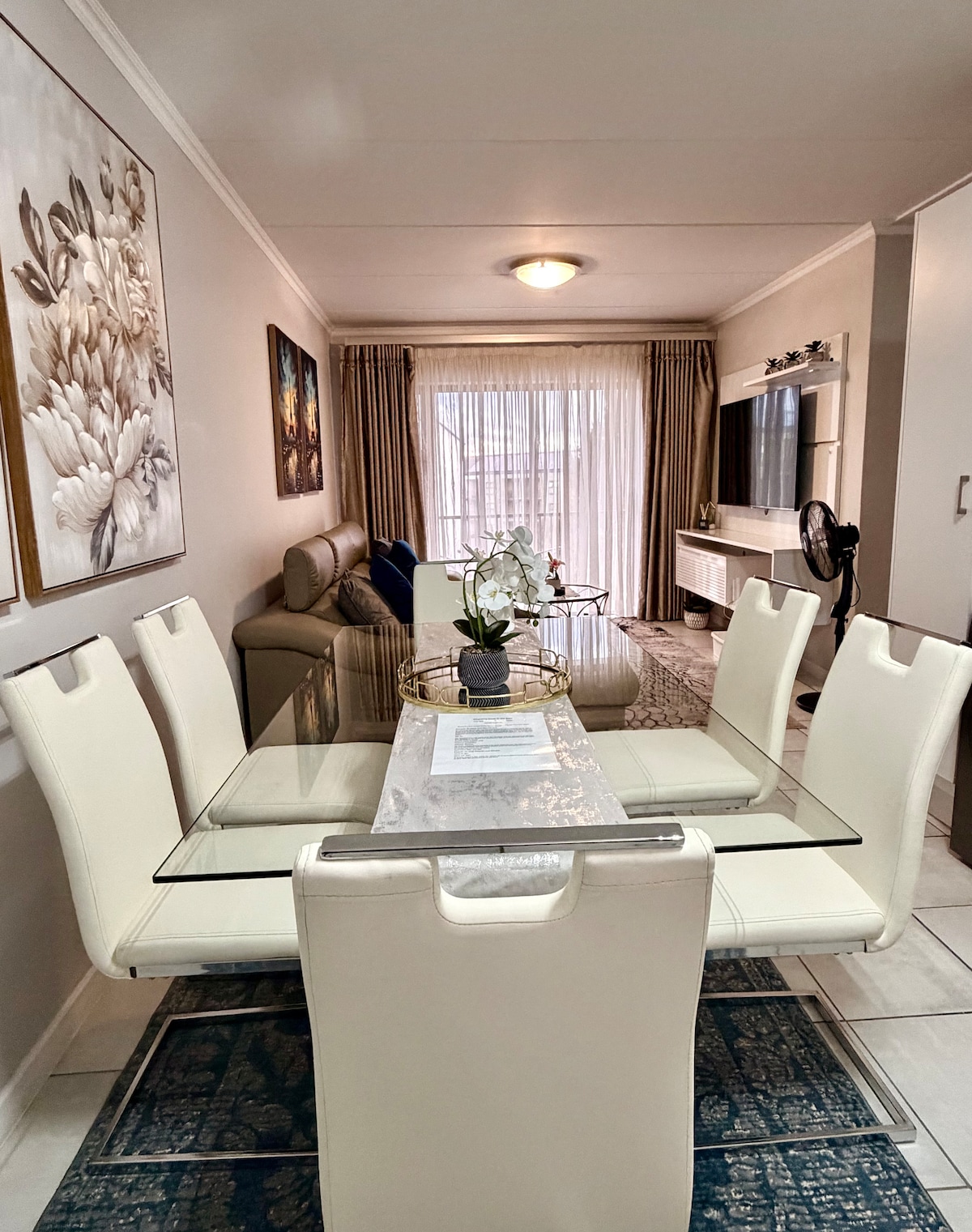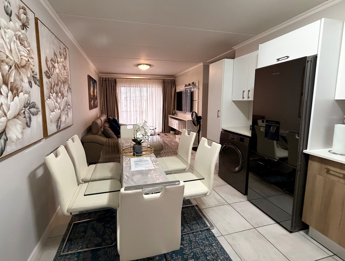 Enjoy a secure and stylish stay in this modern two-bedroom apartment, close to O.R. Tambo Airport. Benefit from 24-hour on-site security guards and convenient 24-hour check-in, ultra-fast Wi-Fi, air conditioning, and UPS-backed power ensuring uninterrupted connectivity and charging during loadshedding. Prepare meals effortlessly with a gas stove and enjoy the comfort of solar-heated showers. Perfect for business travelers and families seeking comfort, security, and peace of mind.