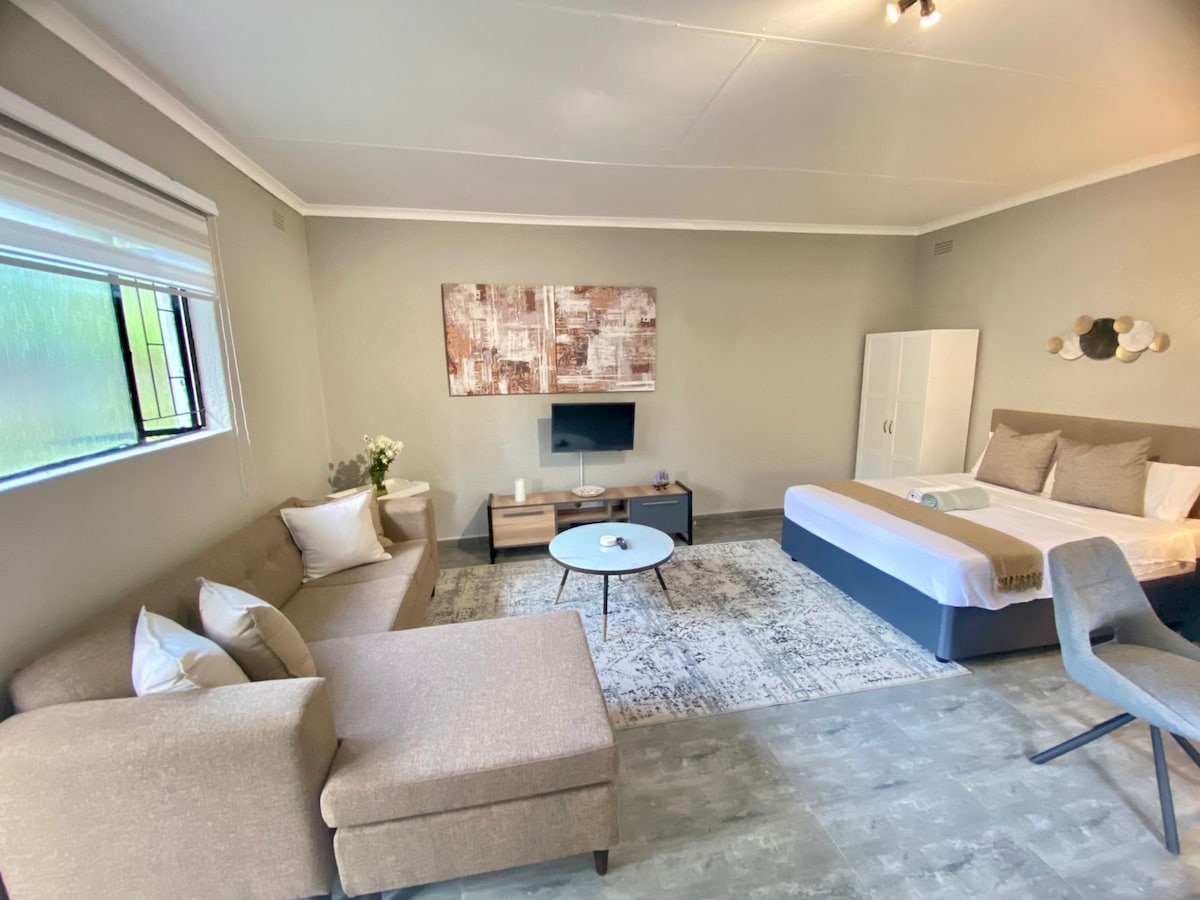 D's Studio is a Luxurious spacious apartment with 3 full bedrooms and en-suite bathrooms. It has a fully equipped kitchen and will make your experience a home away from home experience. We have a generator so you will never be without power. Their is a lovely open garden and outside area to relax in. I love meeting new people and would love to host you and your family & Friends We are a mere 6km from the O R Tambo airport & Emperors Palace Casino and about 2 km from East Rand Mall..
