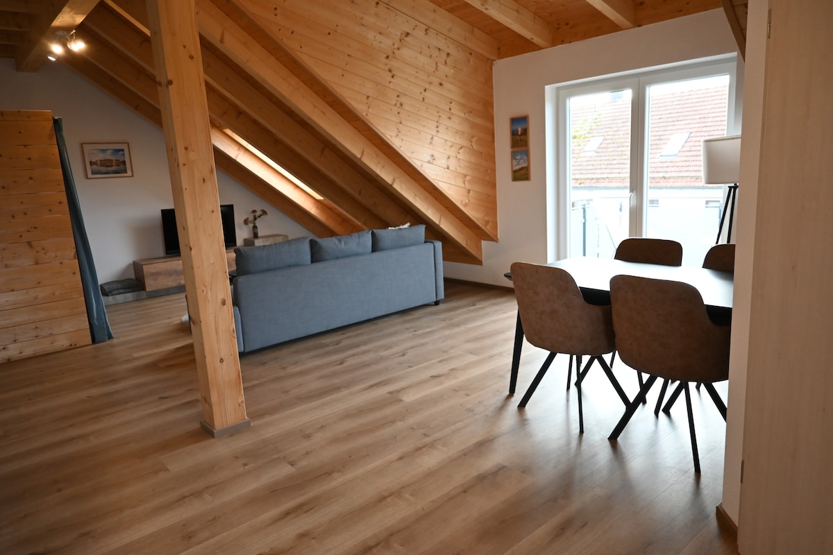 Die Ferienwohnung ist im 2023/24 neu renovierten Dachgeschoss eines denkmalgeschützten großen Hauses ( nach einen Großbrand 2022 im Haus wurde alles von Grund auf saniert) . Sie ist gut ausgestattet, gemütlich und bietet viel Platz auch für Familien mit Kindern. WLAN, TV und eine Spielecke gehören zur Ausstattung. Ebenso eine voll ausgestattete Küche und ein Bad mit Dusche und WC. Hunde können mitgebracht werden, es gibt zwei Katzen im Haus: Mimi und Sally.