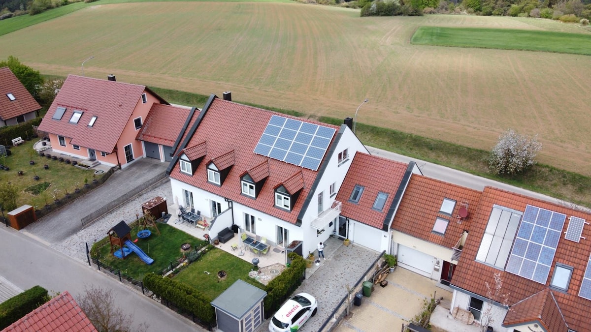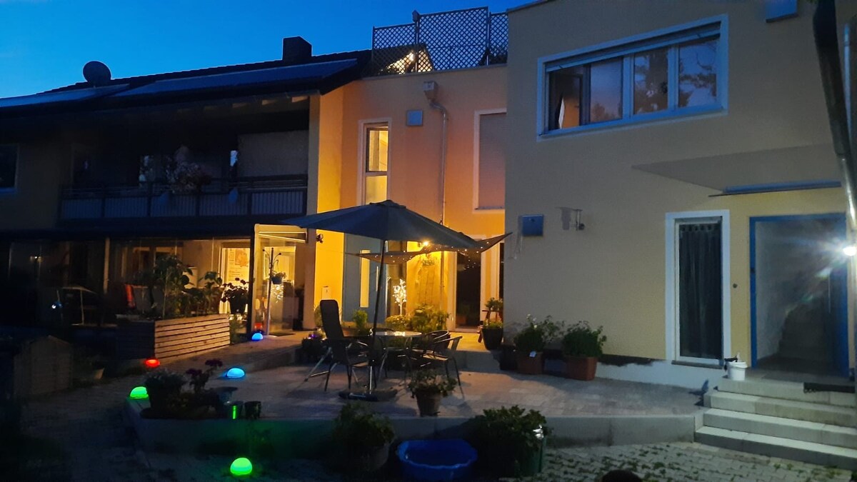 Geräumige Erdgeschosswohnung (ca. 130 qm) in idyllischer Lage. Separater Eingang mit überdachter Sitzgelegenheit, kleiner Sonnenterrasse und gemütlicher Einbauküche. Wohnung hat Wlan, Sat TV, Zentralheizung, Waschmaschine und kostenlose Parkplätze. Unterstellmöglichkeiten für Fahr- und Motorräder ebenso verfügbar (Absprache vorher notwendig). McDonalds, Bäckerei und Supermärkte (REWE, V-Markt) nur 500 m entfernt und leicht zu Fuß erreichbar.