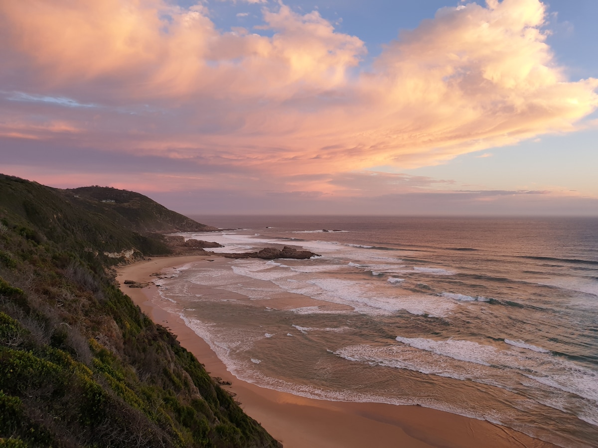 About: Relax with a beautiful view of the Outeniqua mountains, watching picturesque sunsets. Situated 500m from the beach. Walk down a staircase onto the beach that extends for kilometres. Stunning sea view from the top of the staircase. Seasonal siting of whales and dolphins can be seen. Close to the National Park, giving access to bike and hike trails. Variety of fauna, flora and bird life. Restaurant, shop, laundromat is 500m away. Adventure activities to be booked. Town is 7km away.