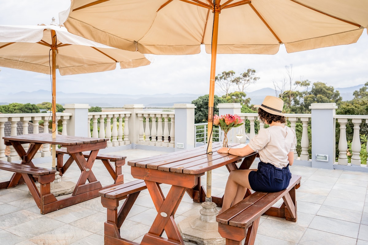 The Tuffet is an elegant studio ideal for couples seeking a romantic oasis in the beauty of the Garden Route. With a private wood-fired hot tub overlooking idyllic views of the lake and mountains, this stylish, secluded space has all the simple luxuries needed to rest in nature. Pet-friendly and off the grid with air con, Wi-Fi, TV, Amazon Prime and all the essentials. Relax and reconnect with each other. Enjoy our farm trails, shared pool with stunning views, and the neighbouring national park.