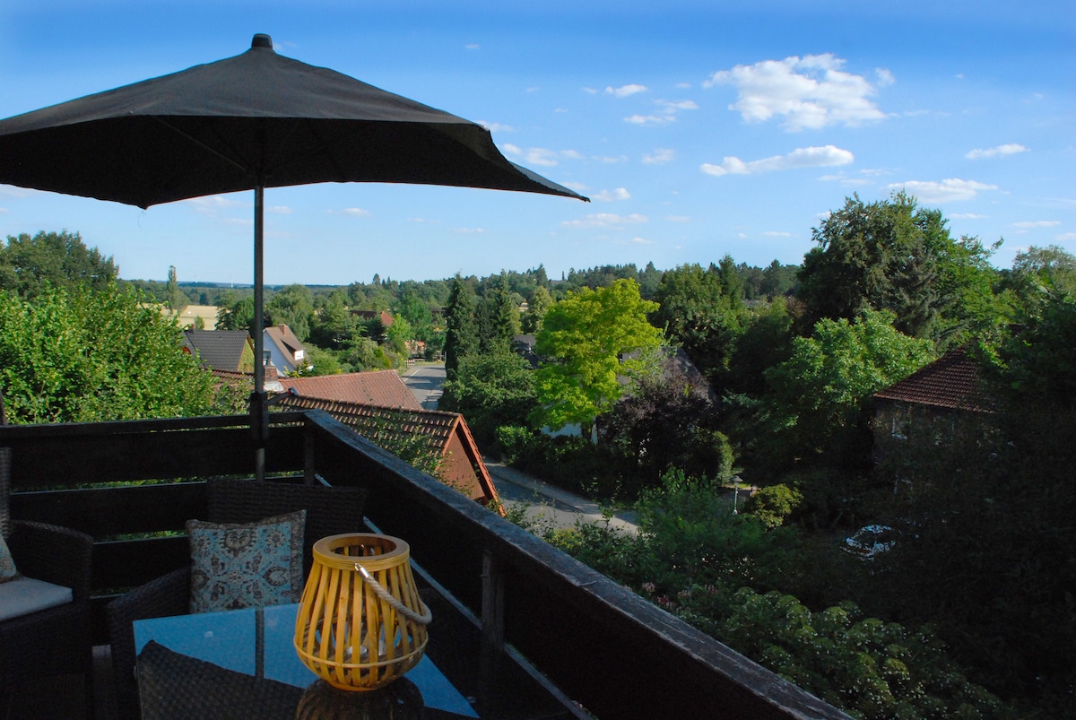 Das Haus wurde 1923 von einem Hamburger Senator als Sommervilla gebaut. Die Wohnung hat einen separaten Eingang, Parkettboden und einen großen Balkon. Von hier aus werden Sie die Nachmittags- und Abendsonne über der unverbauten Aussicht genießen können. Die Wohnung ist neu renoviert. Der zur Wohnung gehörende KFZ-Stellplatz ist über die Grundstückszufahrt mit 20% Steigung zu erreichen. Fahrräder können im Carport abgestellt werden. Info: www.bendestorf.de
