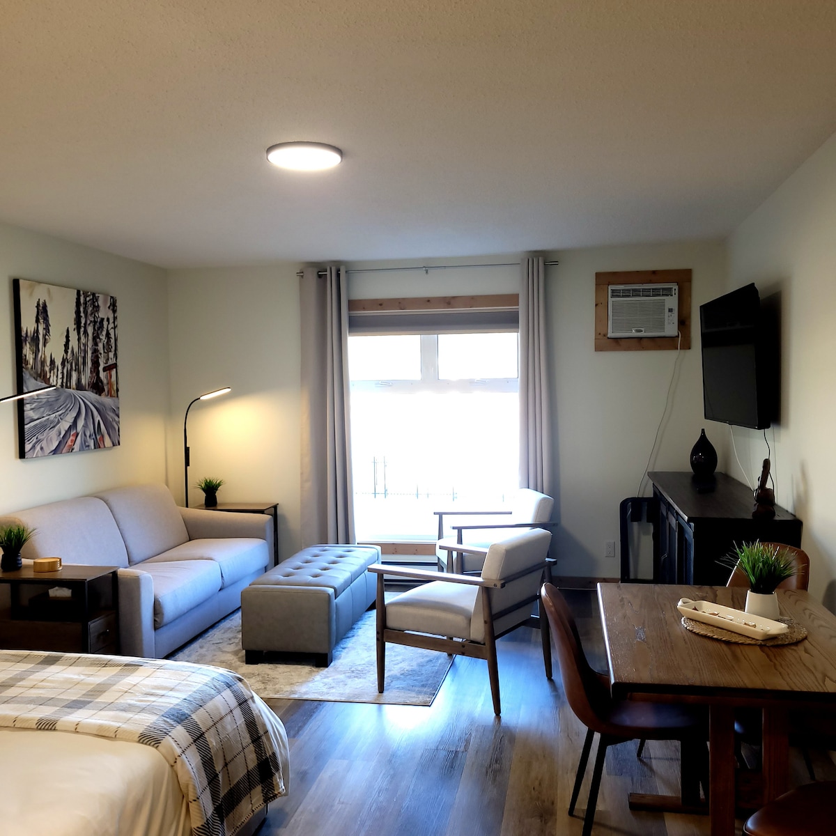 Discover our Kimberley gem, nestled in Platzl's heart. Tall ceilings and abundant natural light. Immerse yourself in Kimberley's vibrant culture with restaurants and shops just steps away. Stay connected with high-speed internet and enjoy our Roku TVs. Despite the hustle and bustle of the Platzl, our triple-pane windows ensure peace. There are 22 stairs leading to the apartment, adding a touch of character to your historic experience. Free parking 30 meters away.