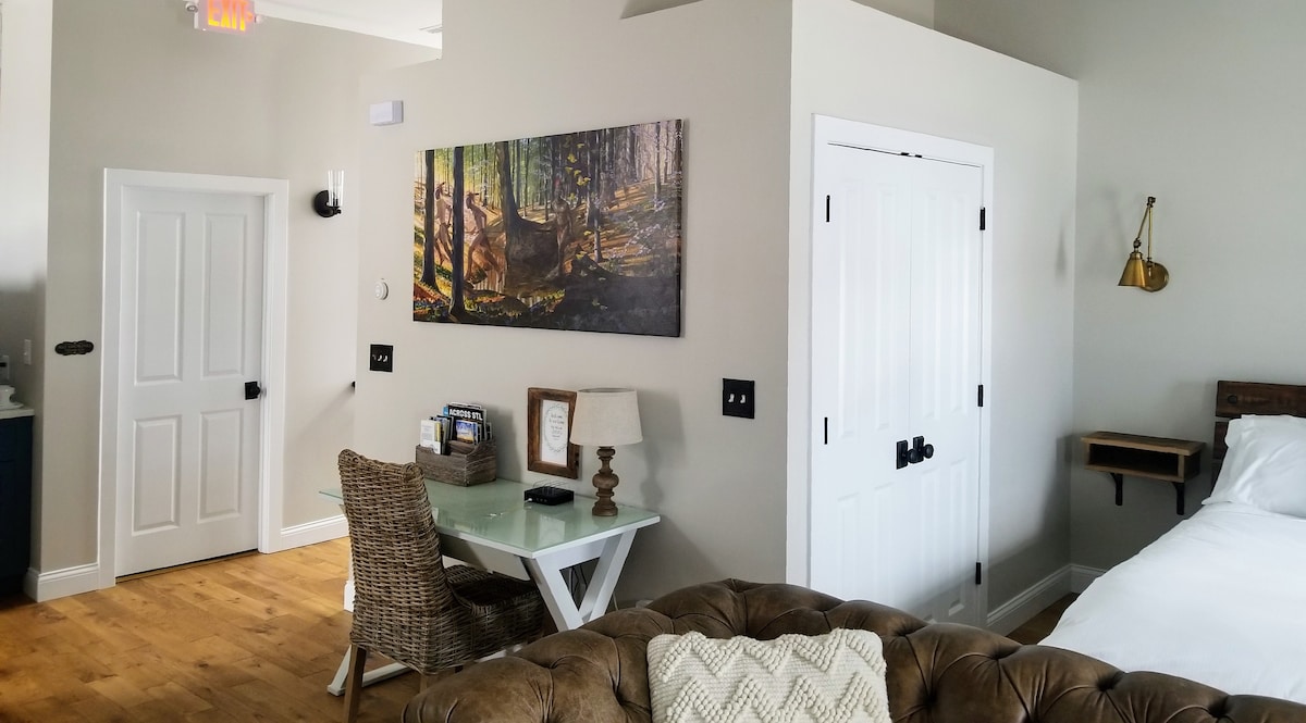 Complete Rehab, this historic 1883 storefront building hosts a well known artist and his gallery on the 1st floor. Above is your "loft space" close to wineries, Amtrak, featuring great views of the Missouri River. You’ll love this Downtown Washington location because of the walkable shops, bars, and restaurants many in historic buildings. The loft is great for couples, solo adventurers, and business travelers who can walk a flight of stairs.