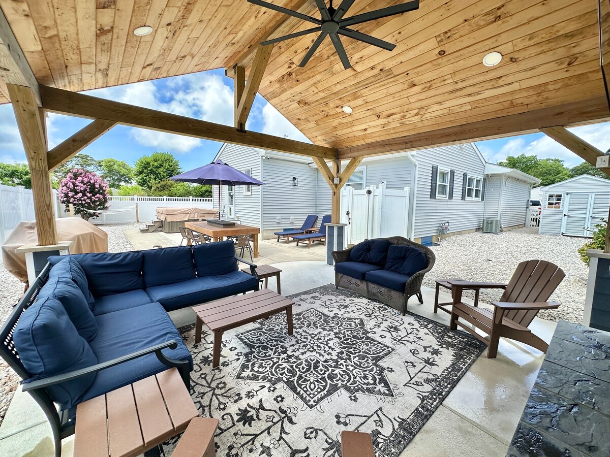 Start your morning soaking in the hot tub, or sipping coffee in rocking chairs on the front porch. Just 1 block away, have the beach all to yourself in this truly secluded beach neighborhood. Enjoy one of the local waterfront eateries or the neighborhood pool. Spot a school of dolphins under a red-sky sunset before returning home to enjoy the night sea breeze and a movie in front of a wood burning fire in the outdoor gazebo. Click our icon to check out our other Cape May homes!