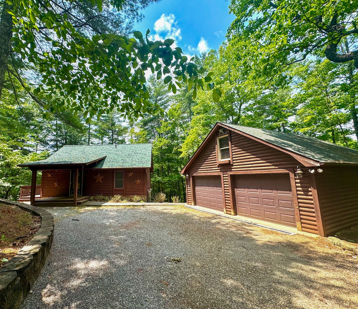 Cozy log cabin home centrally located in Western North Carolina about 40 minutes to Boone/Blowing Rock and 1.5 hours to Asheville and Charlotte. Amazing views in this private and gated mountain community. Enjoy the fresh mountain air as you walk down to community waterfall or take a five minute drive to the public swimming beach on Kerr Lake. When you're home you can grill out, use the exercise room, ping pong, putt, foosball, and much more! Check out our IG @hilltophaven_nc