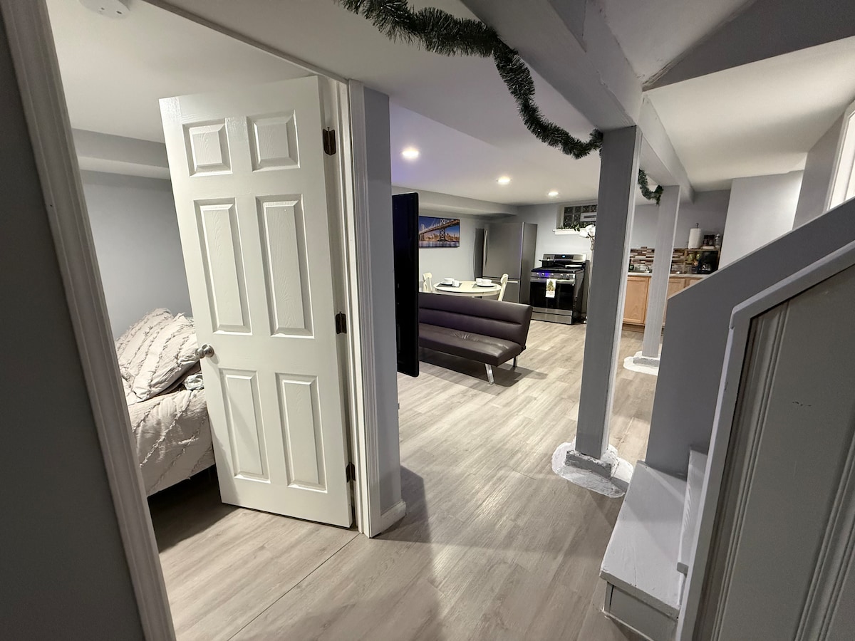 Great location. recently upgraded. Space: This is a new guest suite in the basement of my home. The suite is equipped with a full kitchen featuring high-quality appliances. The suite includes a large bathroom, a bedroom with a new queen-size mattress, and a washer and dryer onsite. The suite offers a peaceful and comfortable place to stay. A 2 block walk will get you to the commuter train, Subway sandwiches, an Italian deli, CVS Pharmacy, and Starbucks.