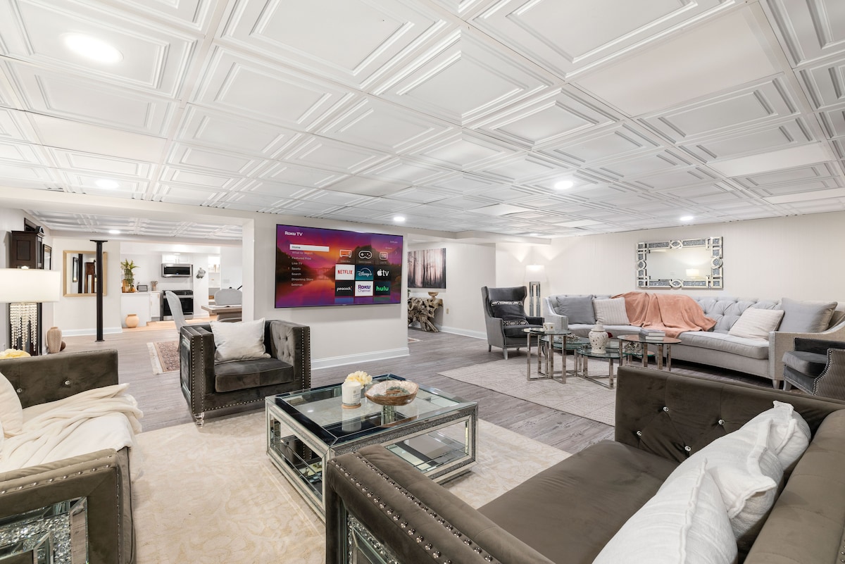 Experience comfort and space in this beautifully designed private luxury basement suite located in a quiet, upscale neighborhood. This spacious retreat features an open layout, elegant furnishings, and a large living area with comfortable seating and a big Smart TV, perfect for relaxing after a long day. Guests also have access to a fully equipped kitchen. Ideal for families, professionals, and extended stays, offering privacy, comfort, while still close to shopping, dining, and major highways.