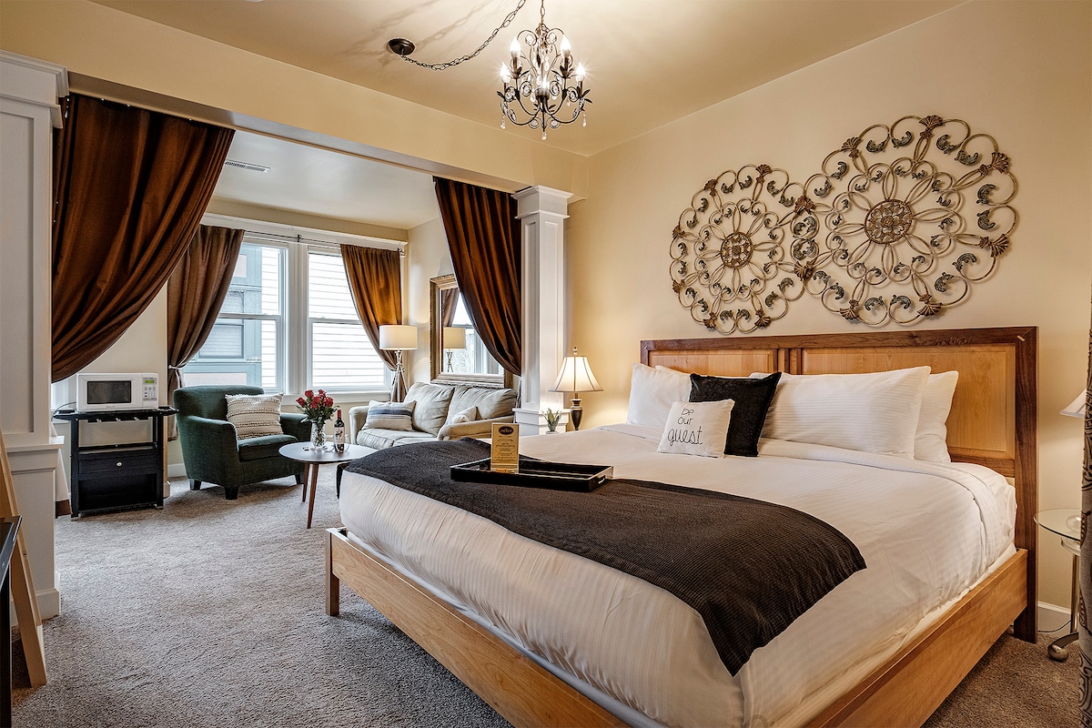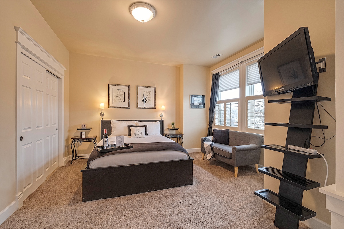 A 2nd floor room in our stylishly reimagined boutique stay in the heart of Eugene, Oregon. Just minutes from the University of Oregon, Downtown, and 5th Street, each of our 11 uniquely designed rooms offers plush mattresses, AC, upscale bath amenities, tiled showers, HDTV streaming, & free Hi-speed WiFi. Immerse yourself in Pacific Northwest-inspired art and comfort. Coffee station, Mini-Fridge & freezer. Perfect for travelers looking for charm, convenience, and a curated Eugene experience!
