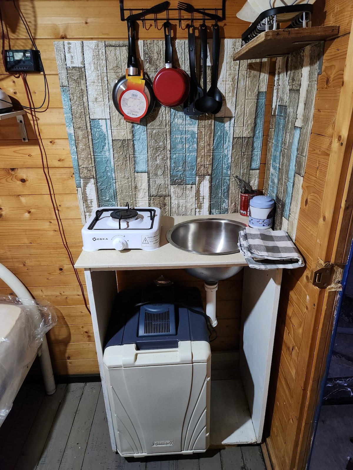It is cabin measure 2.20 by 2.20 meter, where you find a small kitchencabinet, bed and ward rack. Like in the old times the bathroom is outside the cabin. There is one window. There is a ventilator and a fridge and I can also provide you with a jug of ice. The douchecabinet is outside and made of two watertank. Maybe not suitable for woman, neither depressed person. For easygoing person.
