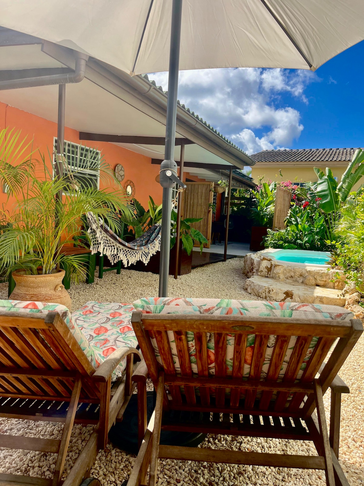 Here at Kas Chikitu, we believe everyone deserves a little bit of paradise. Our lovely guest cottage is centrally located near everything, including Kokomo Beach, Blue Bay Resort, Boca Sami Beach, and Sambil Mall. Our private cottage features a queen-size Murphy bed with a pull-out table, FAST Wi-Fi, a 32-inch TV, a comfy loveseat, a full bathroom, and a kitchenette. Your patio is nestled in our lush backyard, which also has a beautiful lounging pool.