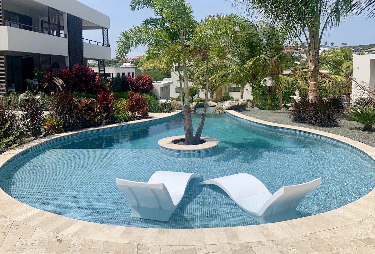 Unwind at this stunning villa located close to Curacao's Hot Spot: Jan Thiel, with beautiful beaches, popular bars & great restaurants. The resort is located at the border of a nature park the Salt lakes with nice walking paths. You will find a stylishly decorated villa with private pool, that is top-of-the-line design, with a view of the resort. You will catch a view of the ocean from the terrace, and the sunsets are breathtaking. The Villa is a perfect place to stay with family / friends.