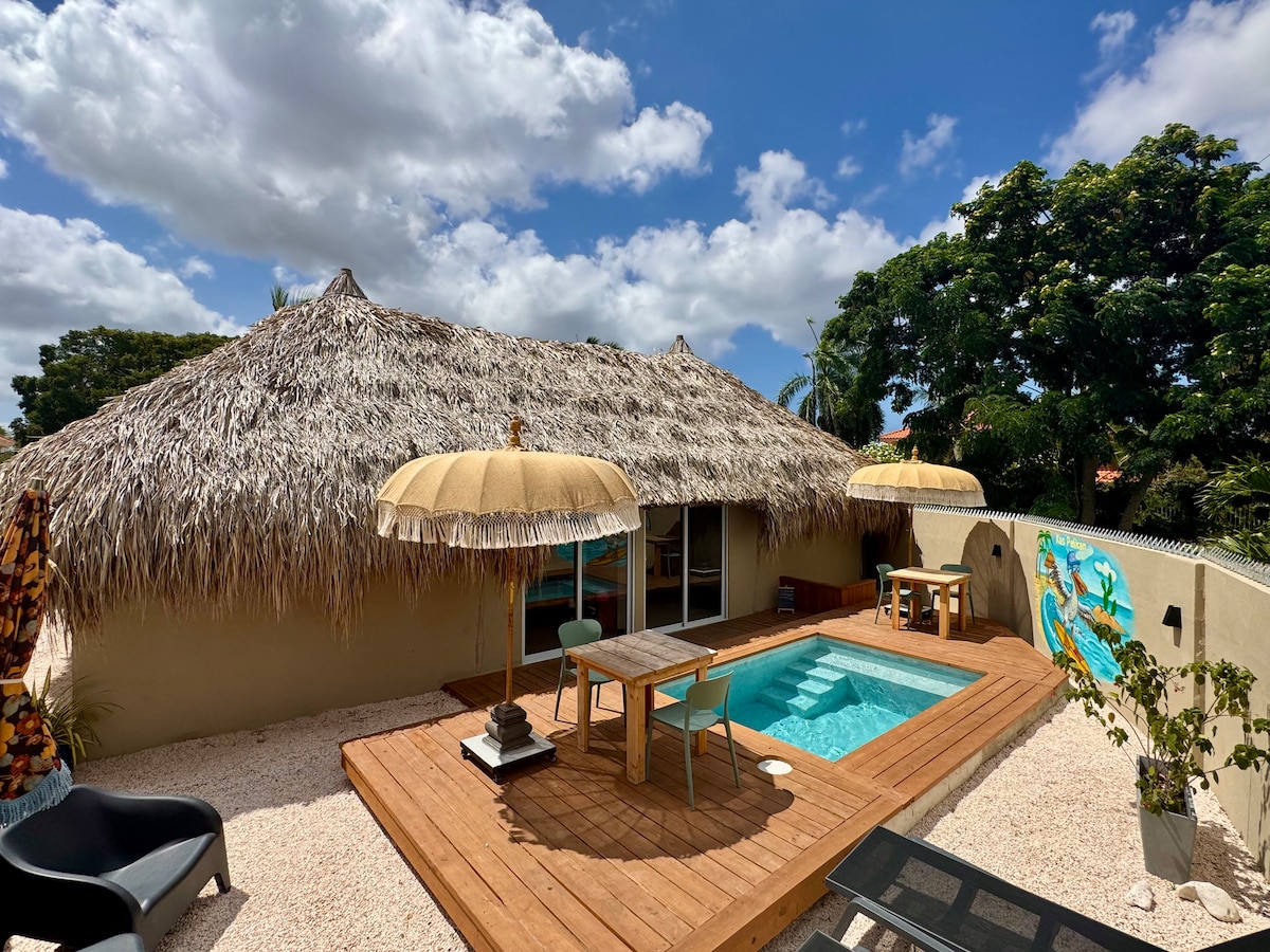 Kas Pelikan is a tropical holiday home in the quiet area of Julianadorp, Curaçao, with two modern 2-person apartments (#1 & #2) under one large palapa. Each apartment has air conditioning, a private kitchen, luxury beds, and comfortable seating indoors and outdoors. In the garden with soothing birdsong, guests enjoy a pool shared by both apartments. Privately located yet central, close to beaches, nature, supermarkets, and the airport. Free parking on secured premises. ⭐ Average 5-star rating