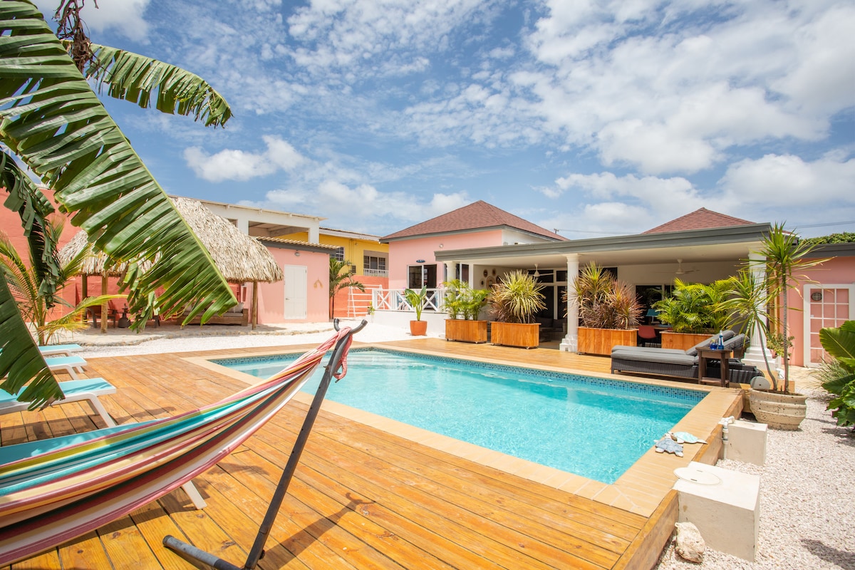 In this exotic mini-paradise with 3 unique apartments it’s all about you! Just 8 minutes from Mambo Beach and 10 from Jan Thiel, this gem awaits. My tropical (edible) garden with palm trees, colorful flowers, parrots, hummingbirds and iguanas is a true eye-catcher. The BBQ, outdoor kitchen, bar, washing machine and dishwasher are all yours to use. Take a refreshing dip in the pool or relax on a sunbed or in a hammock under a banana tree. Bon Bini to dushi Happy Curoase!
