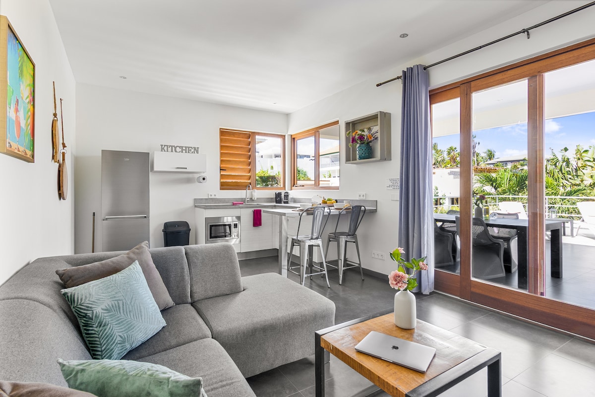 Spacious modern apartment in prime location, enjoy the short 7 minute walk to the beautiful beach, bars and restaurants. The apartment is totally private with your own entrance, living room, bathroom, bed room with AC, kitchen and balcony. The apartment is equipped with a new comfortable bed and a luxurious (sleeper) sofa. The balcony and garden invites you to sit down, take a swim or have a glass of wine whilst watching your favorite Netflix series on the Smart TV in the living and bedroom.