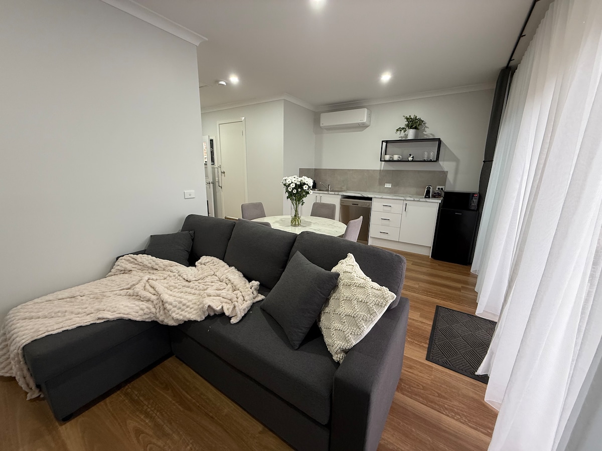 The Laneway Loft is a stylish retreat in Newport, just 20 minutes by train to Melbourne’s CBD and 5 minutes to Williamstown. Perfect for couples, it features a bright loft with a king-size bed, full kitchen, bathroom, open-plan living with Apple TV, desk and chaise lounge, plus a cosy outdoor space. Set at the back of our property with private lane access, it offers comfort, privacy and a memorable stay if you are visiting family, attending special events in Melbourne, working or travelling.