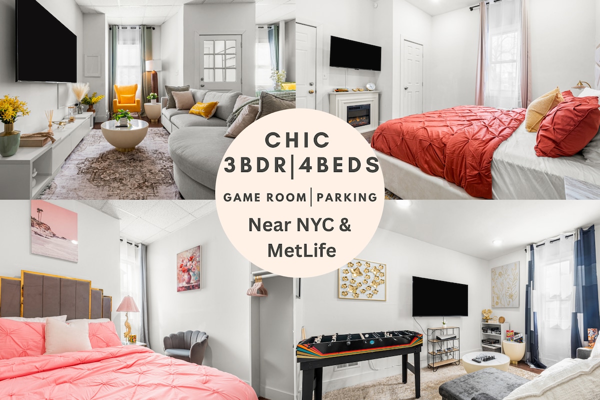 时尚 3 卧房源,带游戏室和停车位,靠近纽约市和大都会人寿保险公司