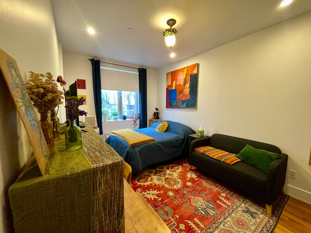 This spacious, city chic, 10 ft high ceiling loft like upscale one bedroom duplex(650 sq ft) w/ a beautifully manicured private backyard(590 sq ft) is inside the boutique condo building in the trendy Brooklyn Bushwick neighborhood. With 24/7 convenient access to a variety of different cafe, organic store, restaurant, bar, supermarket and Laundromat. Blocks away from JMZ express train @ Myrtle Ave & Broadway and 10-25 mins train ride to Lower (Soho, lower Eastside, Tribeca…) and Midtown Manhattan