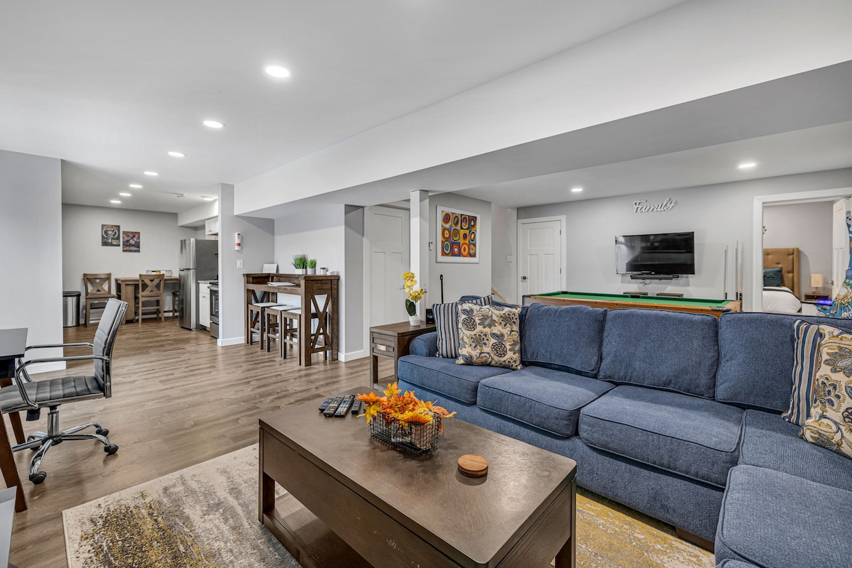 "The Music Cove" Spacious 2 Bedroom 2 bath Full Kitchen Laundry in 1100 sqft Daylight Private Apartment on lower level of home with private entrance and parking (2 cars Max) Large Master Bedroom 4K TV, hardwoods, Futon, Table w/chairs, FULL bathroom w/bathtub. Washer/Dryer in closet Large living room 4K TV, bathroom w/shower. Yamaha 88 key digital piano, acoustic guitar, multi-arcade Ms. Pacman/Galaga/DigDug Second bedroom - 3 bunk & Pull-out trundle/writing desk/vanity/large walk-in closet