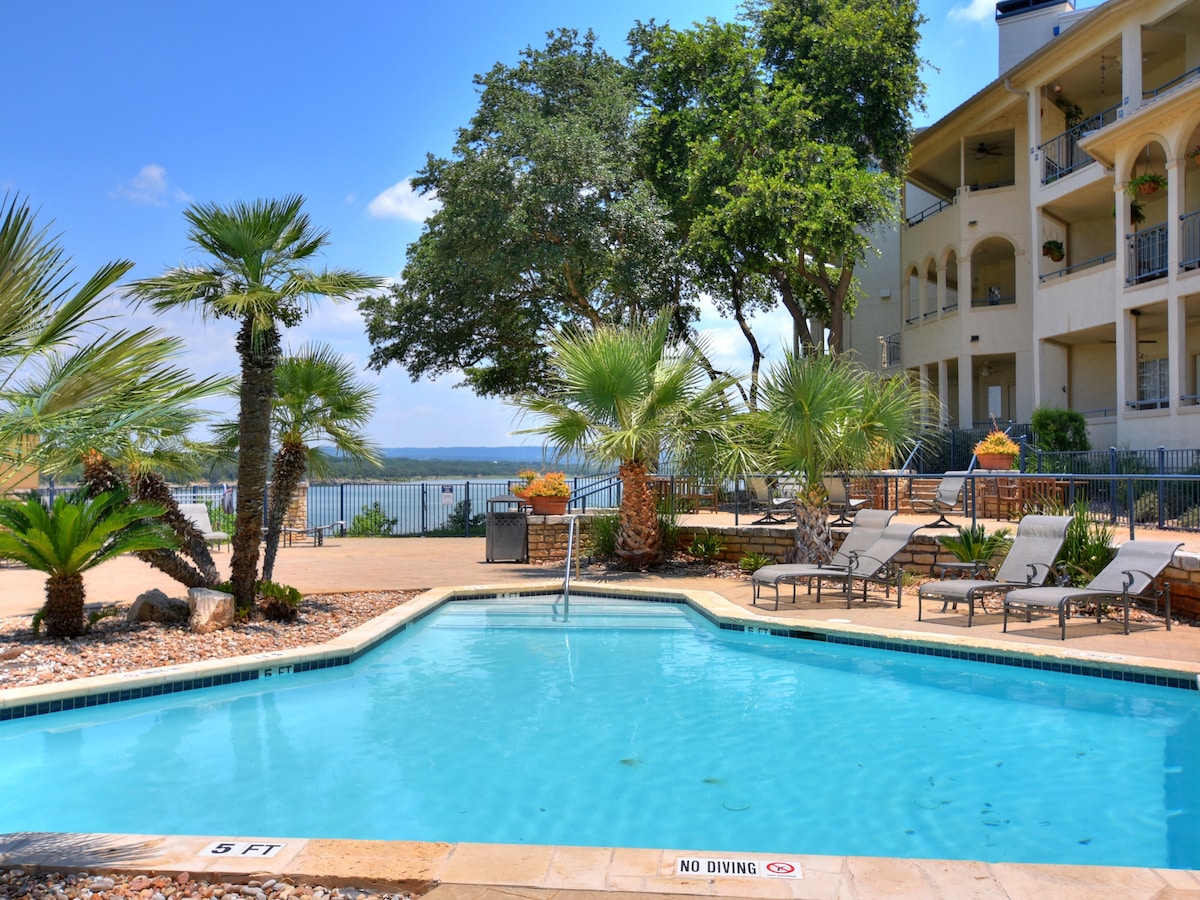 We loved the view so much, we bought the condo! After owning on The Island for seven years, we finally made the condo ours with a full renovation/redecoration. Now, our amazing third story view of Lake Travis within the luxurious 'Island at Lake Travis' is even nicer! You can enjoy the view of the lake with one of the three beautiful pools in the foreground and undeveloped Pace Bend Park in the background. Or, enjoy the Mediterranean style condominium complex located on the private island.
