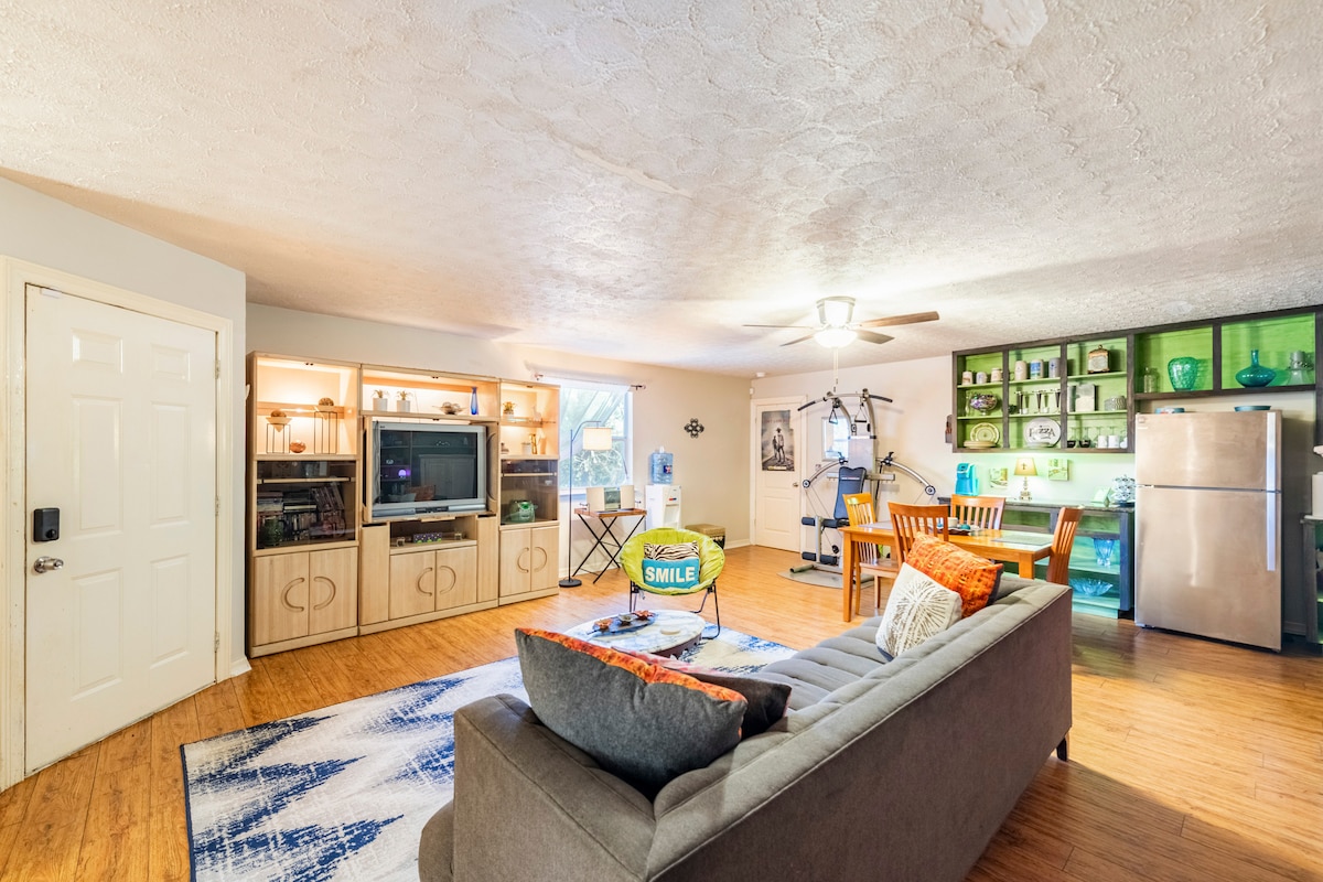This private suite is perfect for snuggling into the King size bed, working from home at the dedicated workspace, or letting the rainfall shower head wash all your worries away. This adorable nook is located less than a mile from historic downtown Round Rock and Woodbine Mansion while only 15 minutes from Austin. Original hardwood parquet floors, plenty of natural light, mid-century modern furniture, and clever art that supports independent artists complete the Sweet Pea Pod design aesthetic.