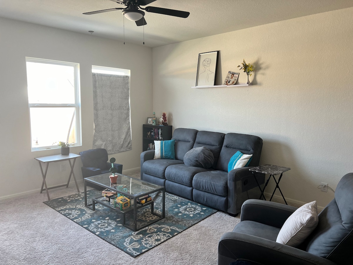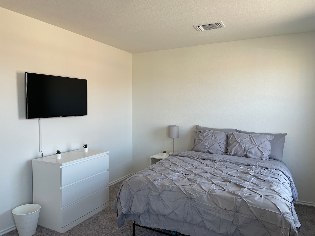 A comfy cozy newer clean retreat: About the home: -Entire house -Cozy and comfy -All new sheets and blankets provided -Plates, cups, silverware etc -Cooking sheets -3 BR 2.5 Bath -Free Parking -85 inch tv -3 Queen beds -Free Fast Wifi - -2 desks for working -Access to community pool -BBQ Grill and back patio seating Nearby: -Plenty of parks -Tons of eateries mins away -AC -Freeway access -Shopping -35 mins from DT / 40 mins from the airport Other: -No smoking inside -No pets -Lockbox code