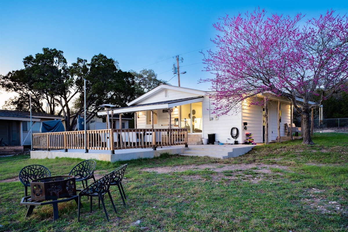 Modern cozy cabin 4 mins from Flat Creek Winery! Welcome to your private escape on Lake Travis! After a long 3-year drought, the water is back, and this modern waterfront cabin is ready to host your next getaway. Tucked away on a quiet, wake-free cove, this is one of Lake Travis’s best-kept secrets—perfect for couples, families, or small groups seeking peace, adventure, and stunning sunsets.
