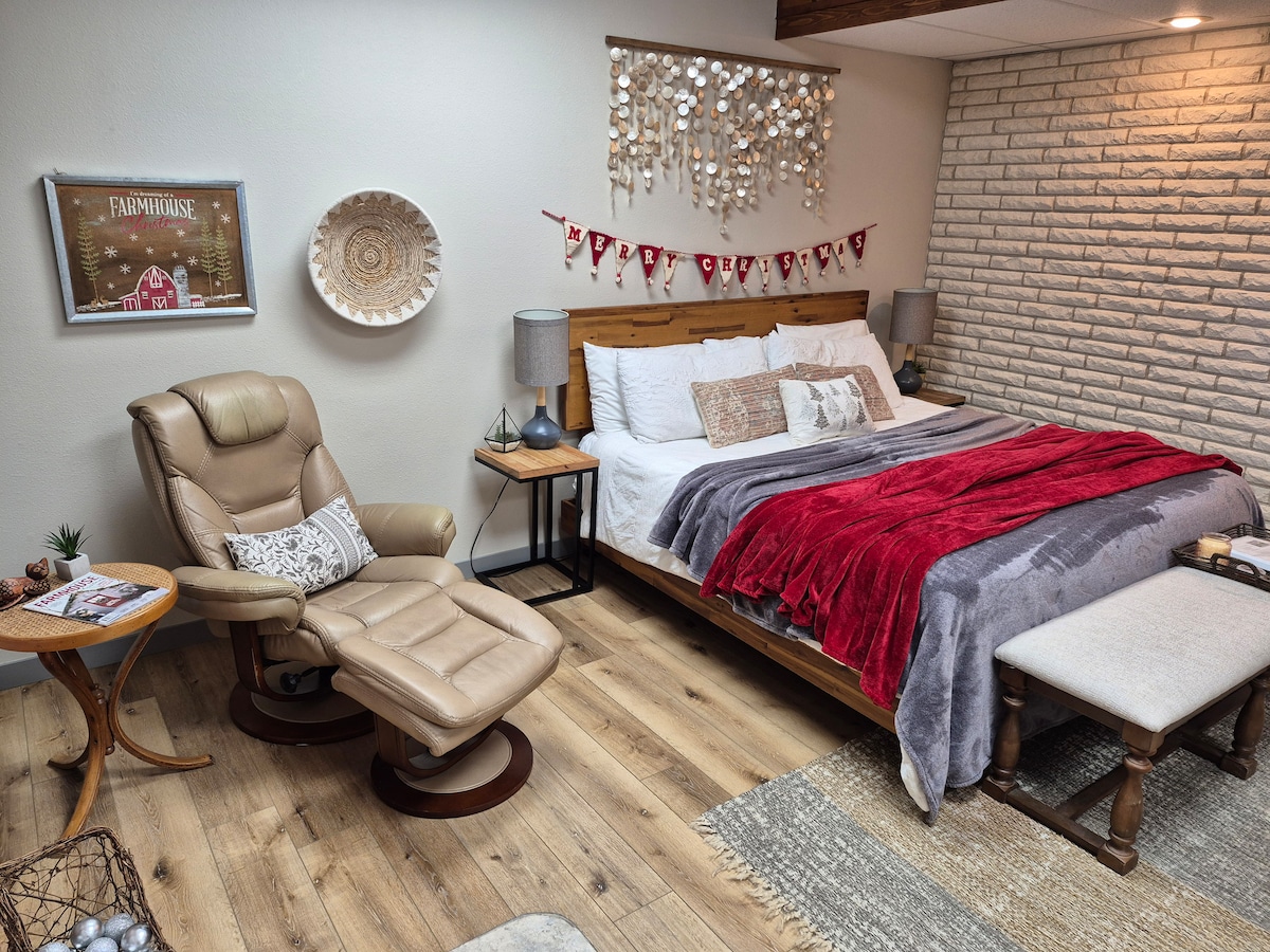 * Casita attached to new home -- No stairs * Private patio * King size bed for 2 adults, bed-side lamps with charging options & outlets, full length mirror & large dresser * Couch, tri-fold memory foam mattress, pac-n-play, & air mattress available, for up to 2 more adults in the living room * 100 MBS Wi-Fi, Smart TV * Keurig with pods: DECAF, regular, tea, cocoa * Small fridge/freezer, microwave, electric tea kettle * Deluxe shower wand, blow dryer * Double closet, iron & ironing board