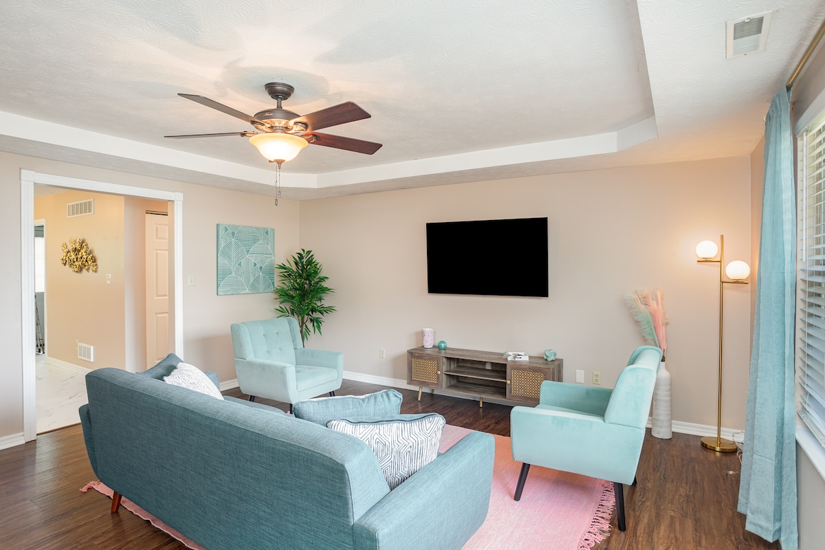 Enjoy the refreshed atmosphere of Rise & Shine! Featuring bright, neutral décor and modern amenities including Wi-Fi, cable TV, a coffee bar & a fully stocked kitchen. Just 4 miles from ARK Encounter, it's perfectly positioned between Cincinnati and Lexington with convenient access to the Creation Museum, KY Horse Park, and Newport Aquarium. This cozy 3-bedroom, 1-bath home offers 2 queen beds, 1 king bed, and 2 single beds, comfortably accommodating your group. Ample parking for 2 vehicles.