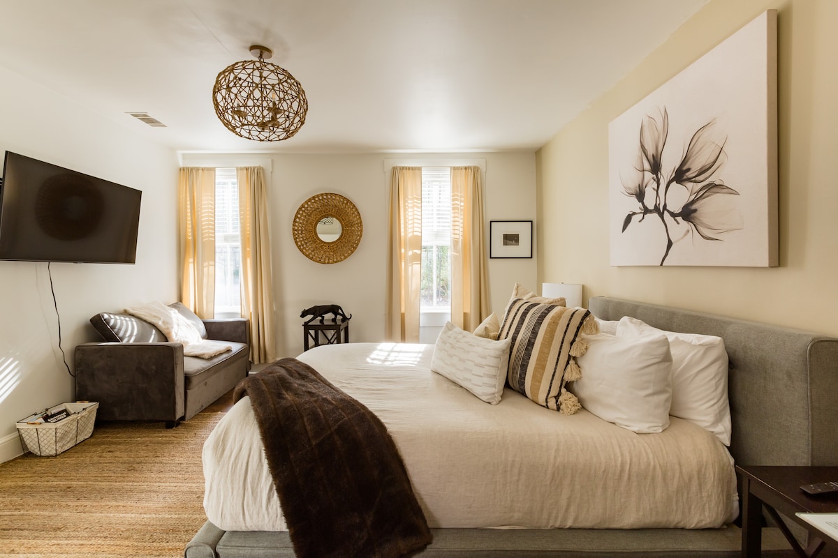 Peaceful treehouse on Wilmington Island. loft39 is a one-bedroom studio apartment, a stylish escape from the downtown Savannah area. Relax in the tree canopy in a spacious private apartment with luxury bamboo bedding on a king size bed, high speed WiFi, 2 smart TVs, dedicated workspace, fully equipped kitchen with bar amenities, fully tiled bathroom with oversized shower, separate living and dining areas, and beach supplies! Private off-street parking included. License # OTC-023656