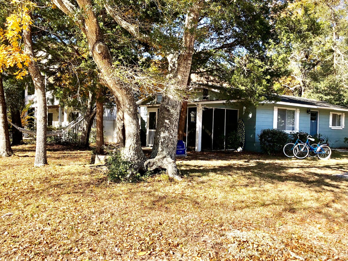 Our 3BR cottage promises a fresh and clean experience that is ideal for your family beach week or weekend getaway. Close to everything Oak Island has to offer - sand, surf, fishing, boating and biking - whatever your heart desires. A well stocked kitchen to enjoy a dinner in or treat yourself to one of the many Oak Island and Southport restaurants. Guests rave about the screen porch with the "Where Have You Been All My Life" hanging bed and the new backyard firepit. Come, relax and enjoy!