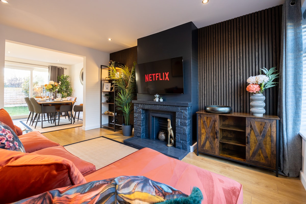 Social Media: 'Manchester Hidden Gem' for direct booking Luxury Private Retreat – Ultimate WOW Factor! Step into indulgence at this stunning gated escape, where elegance meets fun. Unwind in the hot tub, enjoy movie nights in one of two stylish lounges, or challenge friends in the games room. Cook and entertain in the sleek open-plan kitchen, all set in beautifully secluded surroundings. A five-star experience from the moment you arrive. Extremely close to Manchester Airport & City Centre.