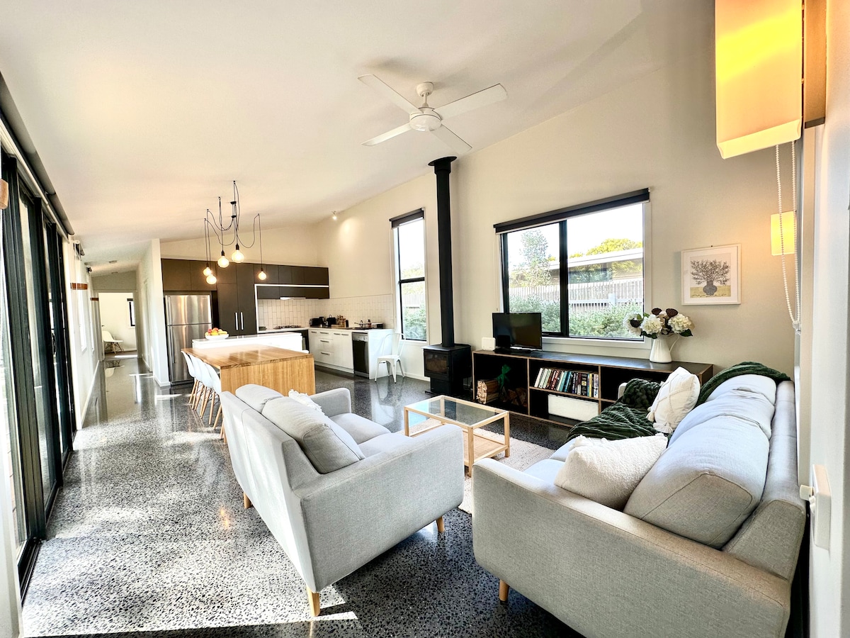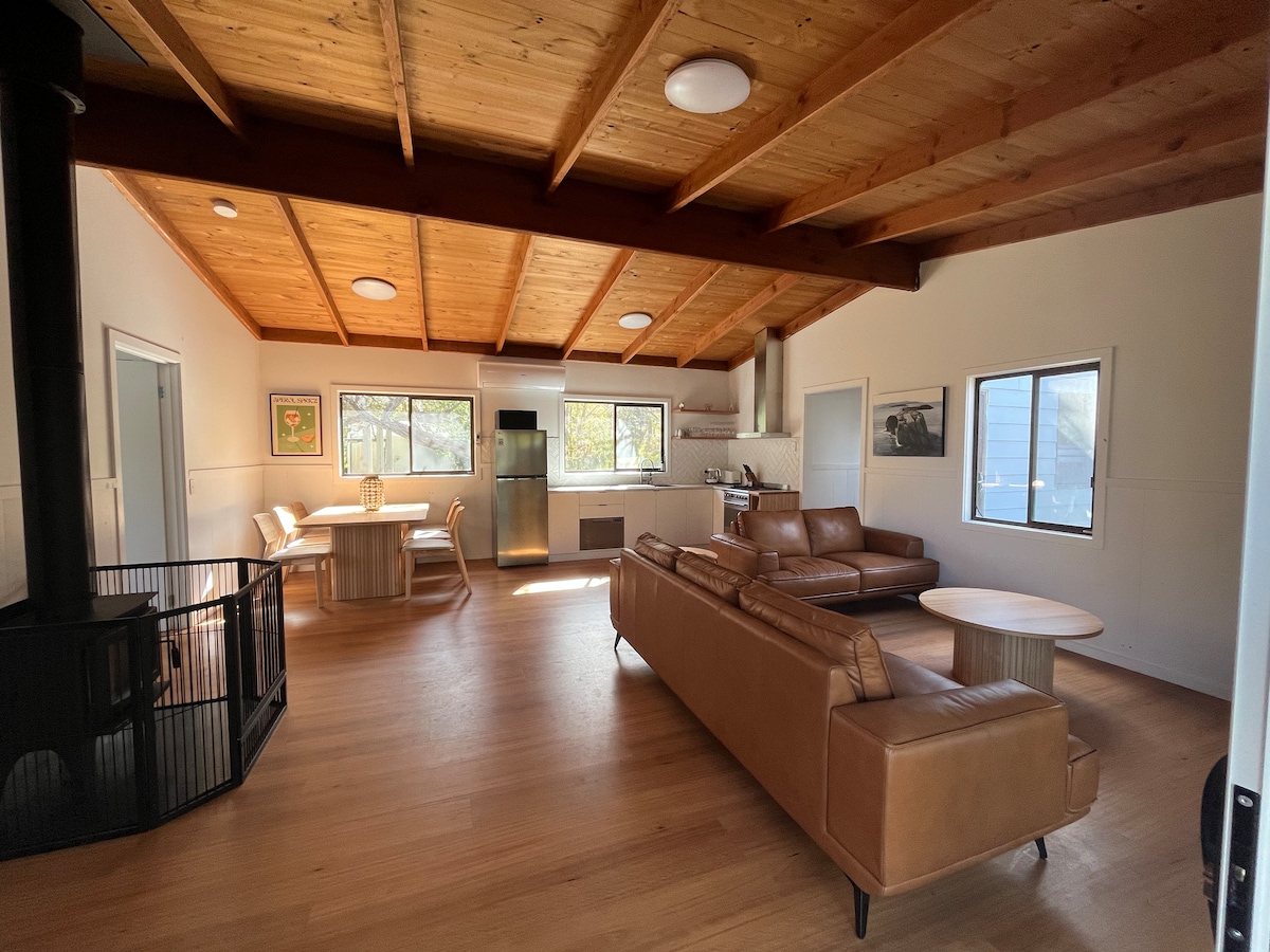 10 minute walk to beach. Comfort awaits those who roost at Venus Bay’s original 50’s two bedroom beach house - with a full modern restoration. Free Linen, Firewood, Netflix, A/C, Wi-FI - all included; you're on holiday! Min 5 nights for summer holidays. Stylish modern kitchen & appliances, easy to connect tech & inviting light filled spaces. Compact in size, generous in vintage vibes. The Rookery is a perfect romantic retreat, double couple fun, or small family escapade. Dogs welcome!