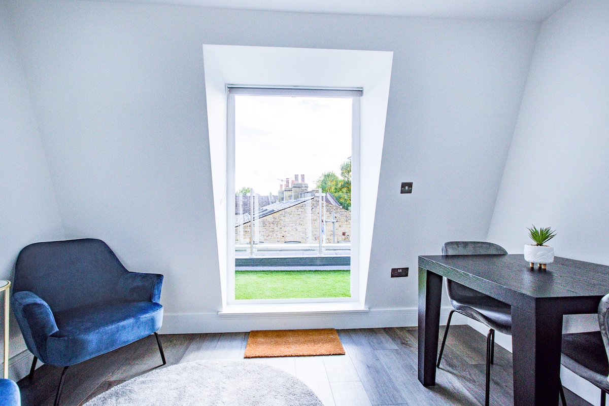 Begin the day with a cup of tea on the sun-washed roof terrace before returning to a sparkling white kitchen to make breakfast. A comfy sofa offers a delightful spot to read a book within this crisp apartment in a charming Georgian building. This brand newly refurbished top floor flat is centrally located within minutes of Fulham Broadway tube, giving you versatile access to all of Central London. A bright and airy reception room enjoys a brand new kitchen with convection hob, oven, fridge, microwave and a Nespresso coffee machine. The open plan kitchen/ living room enjoys a bespoke fitted bench seating area. The reception has USB ports for charging your phone (please bring your phone cable) and a newly installed TV with Netflix. The reception rooms opens out onto a south west facing terrace overlooking mature trees that lead to the park. A perfect spot to enjoy a morning coffee or an early evening drink, enabling you to soak up the buzzy atmosphere. Free Wifi is available. The bedroom suite enjoys bespoke fitted wardrobes with hangers and a brand new ensuite shower room with rain shower and feature lighting. We supply one set of fresh linen for your stay, Nespresso coffee, tea, milk, sweeties and a bespoke handbook to guide you to local restaurants and necessities. Whether your stay in London is for business, touring, shopping or simply pleasure, this is an ideal central location in London. To the rear of the building is access to coffee shops/ restaurants and a delightful park, with Boris Bikes available to rent should you fancy taking a tour. 07703004354 - I am virtually 24/7! There is a bus stop just outside the apartment with routes that offer short trips to popular London attractions. Harwood Road Apartments are ideally located very close to Fulham Broadway, giving you access to the whole of central London via the underground network and multiple bus services. The area has a buzzy vibe and a large collection of restaurants and shops offering a wide range of cuisine from French (Cote Brasserie) to Thai (£9.95 for a two course lunch opposite the flats) to Byron Burger to an Oyster Bar. There is a gym, cinema and a beautiful park (with tennis courts) all within a stones throw!