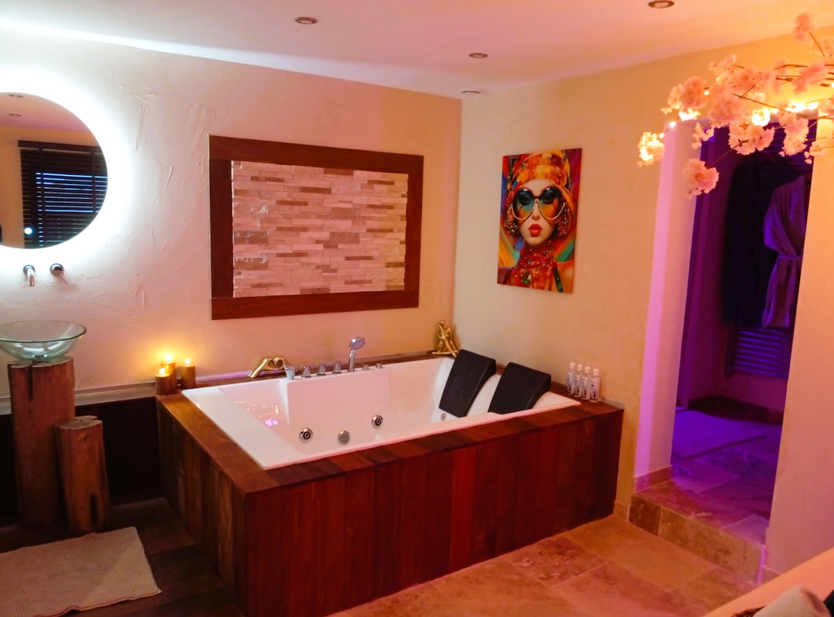 Détendez vous en amoureux,entre ami(e)s dans un endroit pensé pour se relaxer. Située en cœur de ville, cette suite à la déco raffinée vous propose une cuisine équipée , un espace salon , une chambre dotée d'un lit king size avec sa tête de lit majestueuse. Cet endroit est unique car le seul de la ville à offrir simultanément table de massage professionnelle, cour privative avec hamac et baignoire balnéo 2 places alliée au confort d'une eau adoucie. Parking vélo fermé et kit bébé à disposition