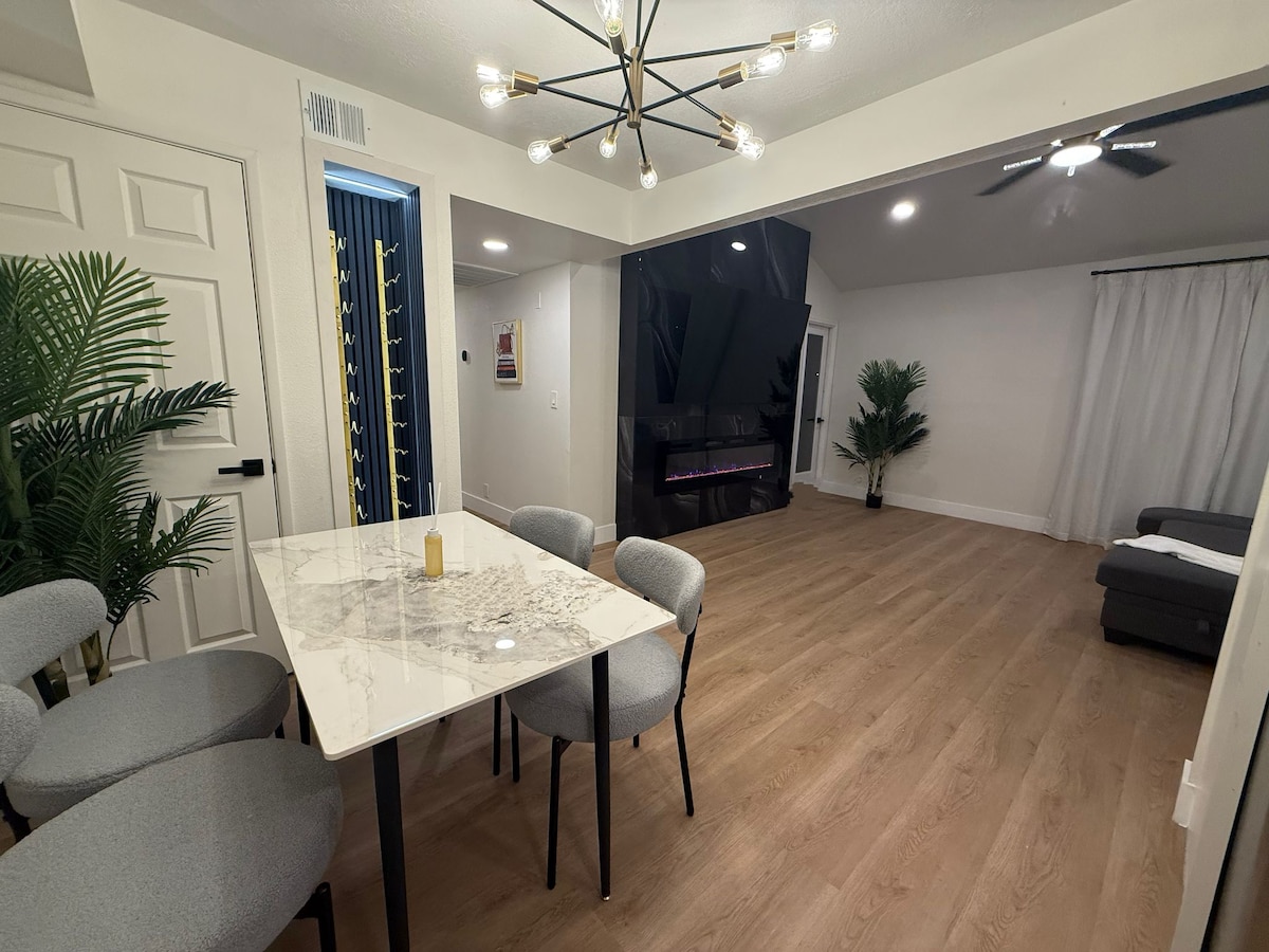 RARE on the market! This absolutely Stunning, fully remodeled Artsy home with a POOL, BUSINESS CENTER, CHEF KITCHEN is in the heart of historic DOWNTOWN-just 5 min drive to Las Vegas Strip, 10 min to Convention Center and 3 min to Fremont Experience. Nestled in a peaceful neighborhood this exquisite retreat is ideal for guests seeking luxury, comfort, and fun all in one place. Thoughtfully designed and beautifully equipped, this home meets all your family, business, and leisure needs.