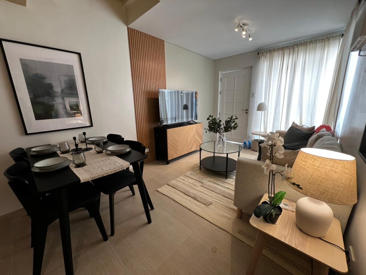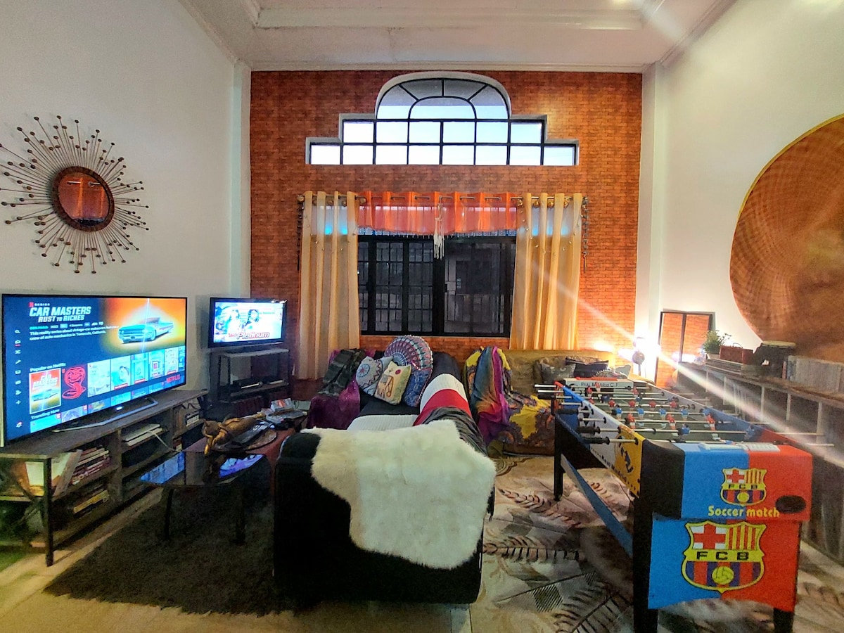 MINIMALIST SCANDI-INDUSTRIAL DUPLEX short drive to famous Balay Dako, Starbucks Hiraya, Leslies, RSM, Bag of Beans Charito, Farmers Table, Ayala Serin Mall, Lourdes Church & Sky Ranch House has 2 bedrooms with aircon, living area with sofa beds, 3 T&B with shower heater, dining, kitchen, workstation, backyard with game room and a parking garage for 1 Sedan or SUV. Enjoy the PLDT Fiber WIFI 35mbps, 55” Android TV with NETFLIX, 48” Foosball & board and card games for bonding.