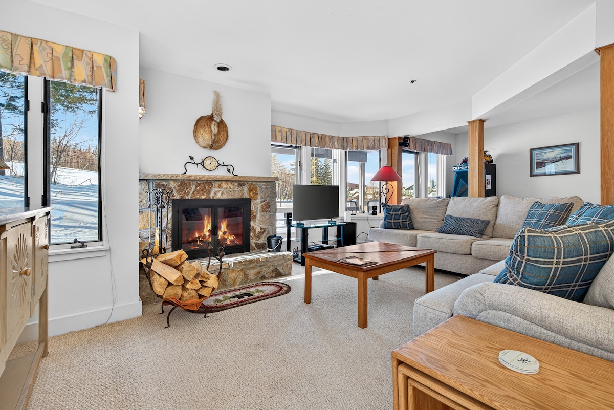 Directly on the mountain. Minutes walk to 2 trails. Full kitchen, dishwater, washer/dryer, microwave. Fireplace with free wood. Large screen TV in living room and tv in each bedroom. Plenty of board games. King size bed in Master. Free parking for 2 cars. Ground floor with deck with tables and chairs for relaxing. Free parking. The pool (indoor & outdoor) and hot tubs are free to renters as is fully equipped gym (all year) and tennis courts in summer.