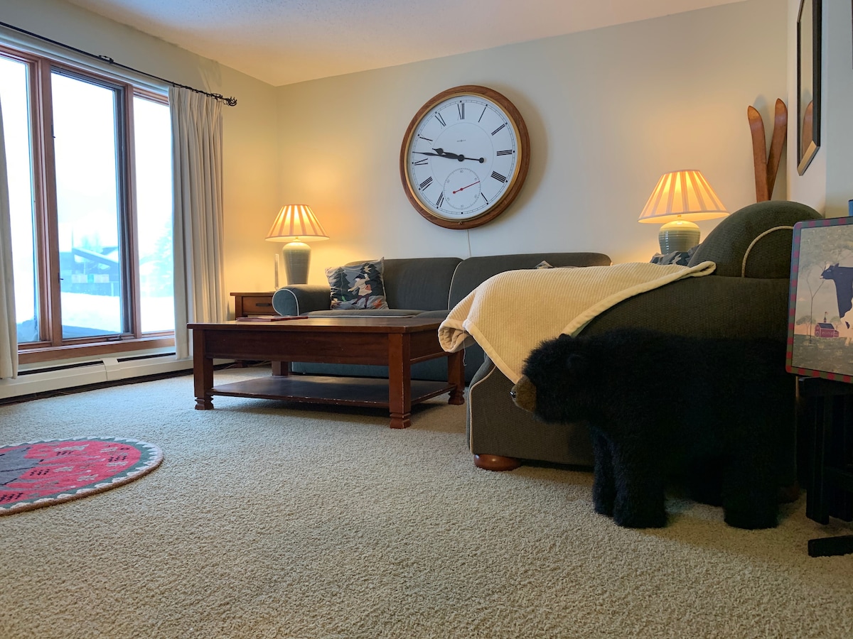 Directly on the mountain. Minutes walk to 2 trails. Full kitchen, dishwater, washer/dryer, microwave. Fireplace with free wood. Large screen TV in living room and tv in each bedroom. Plenty of board games. King size bed in Master. Free parking for 2 cars. Ground floor with deck with tables and chairs for relaxing. Free parking. The pool (indoor & outdoor) and hot tubs are free to renters as is fully equipped gym (all year) and tennis courts in summer.