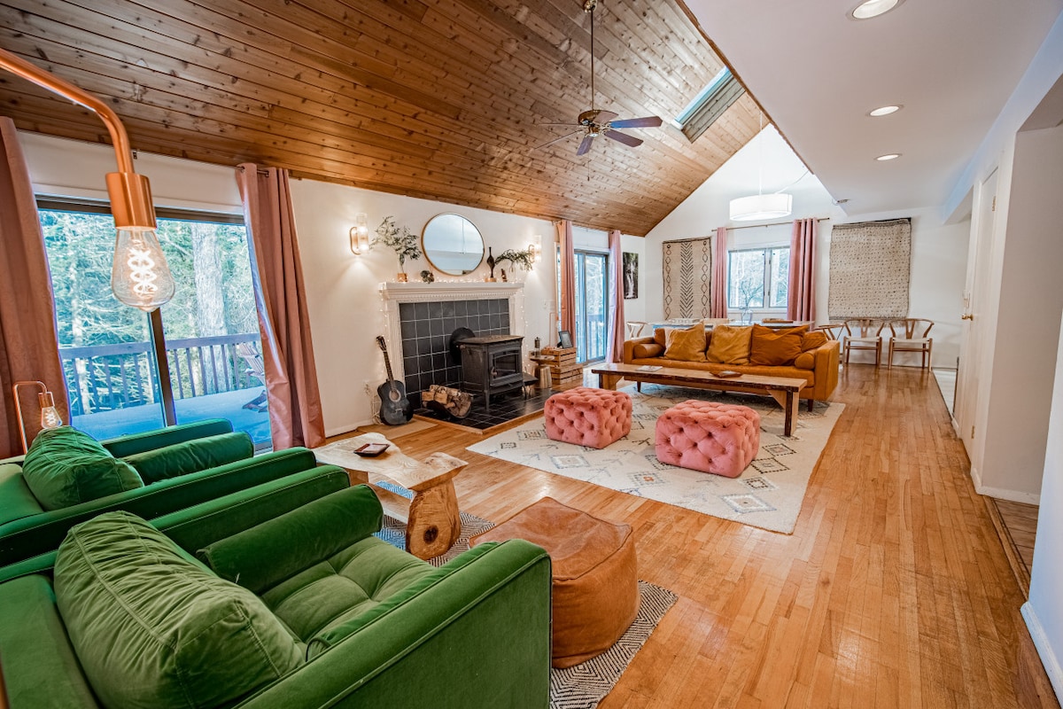 Scenic country cabin located between Hunter Mountain and Windham Mountain, in the charming hamlet of Maplecrest. Surrounded by trees and the wilderness, it creates an idyllic mountainside escape, private and secluded grounds with only night stars and the sounds of wildlife. The decor is a mix of modern, color, and comfort, with lots of natural wood details. Both ski mountains are only a short 10 mins drive away. This is a great place for a romantic getaway or an outdoor trip in the Catskills.