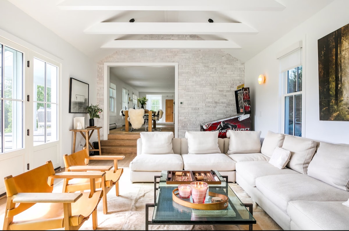 Welcome to our new Scandinavian designed 5 bedroom, 3 bath treehouse in the Hudson Valley. Experience a relaxing nature setting w/mountain view, 6 min. drive to downtown Woodstock, launchpad to Hunter, Belleayre, nearby wineries & hiking trails. The house offers a private setting, borders a nature preserve, & features a chef's kitchen, living room w/fireplace, cathedral ceilings, wrap around deck, screened in porch, new jacuzzi spa, large movie room, pool table, ping pong table, & more.