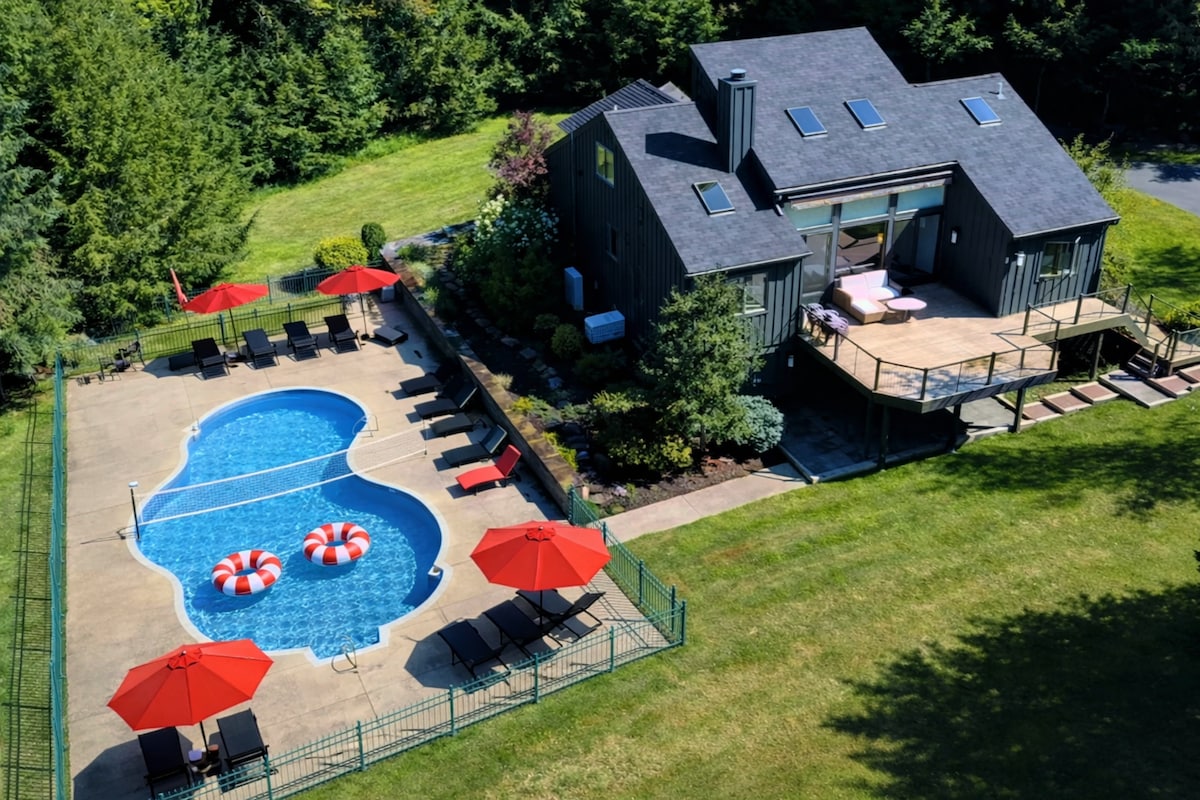 Stunning, tranquil mountainside retreat with exposed beams, saltwater swimming pool, sauna, fireplace, soaking tubs and rain shower. Situated on a 5-acre wooded hilltop a ten minute drive from Woodstock and close to miles of walking trails. Roast marshmallows on the fire pit, flip burgers on the top of the line charcoal grill, and enjoy one of the best stargazing spots around. Indoors, find a well equipped kitchen and cinema sized tv screen with Netflix/Apple TV. Convenient to ski slopes.