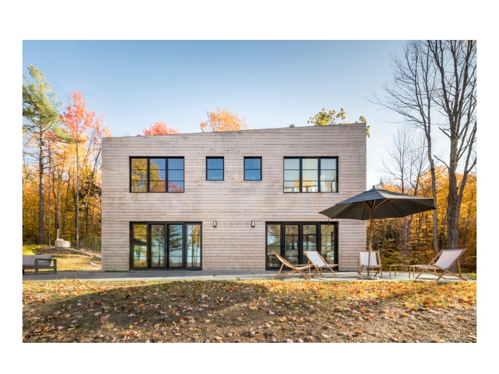 带热水浴缸和电动车充电站的现代小木屋