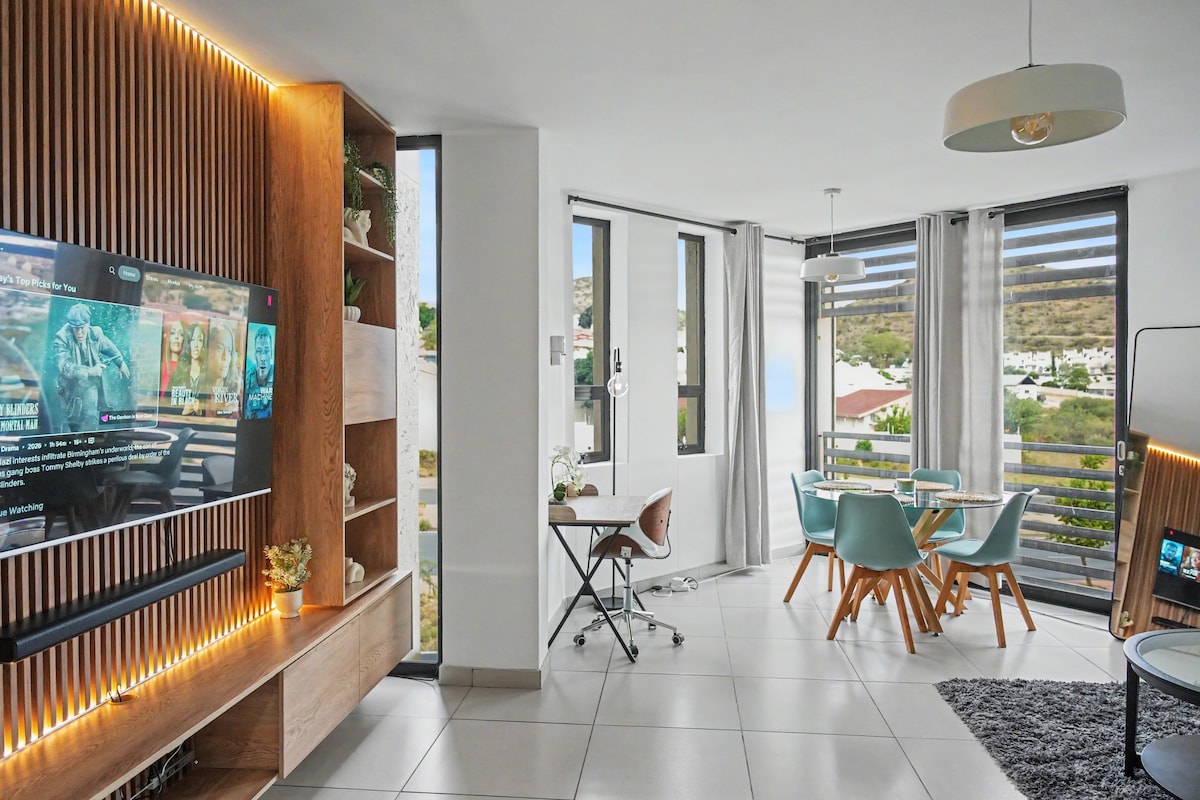 Stylish city flat for the modern traveler. You're in the heart of Windhoek, yet very private, with a stunning view of the sunset from the 4th floor. Sleep in a luxuriously fitted queen size bed in a room with a view. Have sun-downers on your private balcony. Watch free Netflix or any of your favorite programs on a 75'' flat-screen. Take a dip in the communal mini-pool or have a barbecue in the communal braai area. Safe inside parking. Good Wifi. Only 1 direct neighbour. Safe and quiet.