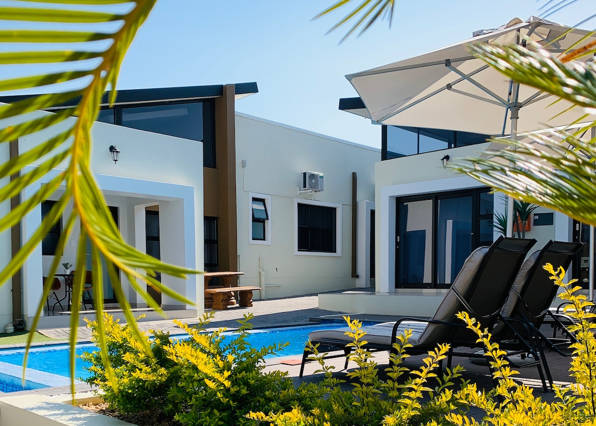 A Tastefully Curated Private Luxury Suite nestling in a Tranquil Tree Filled Garden with a Sparkling Pool Private Entrance Free Fast Uncapped WIFI Free and Safe onsite Parking Centrally Located in the Safe Neighborhood of Luxury Hill Walking Distance to Maerua Mall, City Centre and some of the Best Restaurants and Attractions Windhoek has to offer. The Perfect Place to Kick Off or End your Namibian Adventure or Business Trip