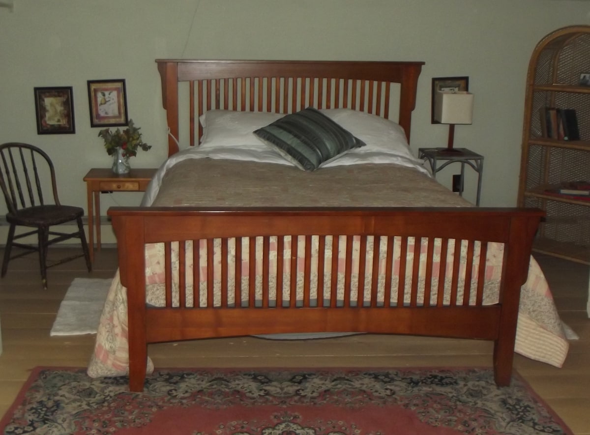 Beauty, luxurious comfort, and cozy charm combine in this 1780 farm house nestled between mountains and the fertile Williams River valley. Hawthorne is a 1st floor ADA accessible suite. Snuggle into your queen bed, enjoy an espresso while lounging in the library or on the porch, or stroll along the fields, forests, and river. A delicious farm breakfast featuring local and seasonal foods is served daily. We strive to minimize our carbon footprint through use of solar for AC and heat.